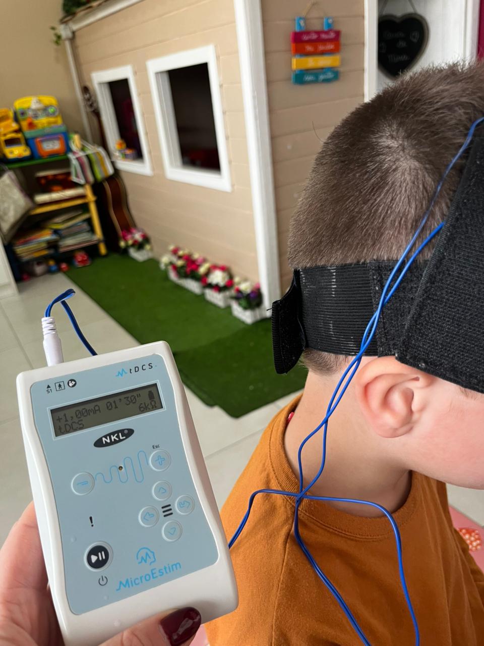 A estimulação cerebral (tDCS) ocorre durante 20 a 30 minutos desse tempo, enquanto o paciente participa das atividades terapêuticas personalizadas, tornando o cérebro mais receptivo aos estímulos e ampliando os resultados da fonoterapia.